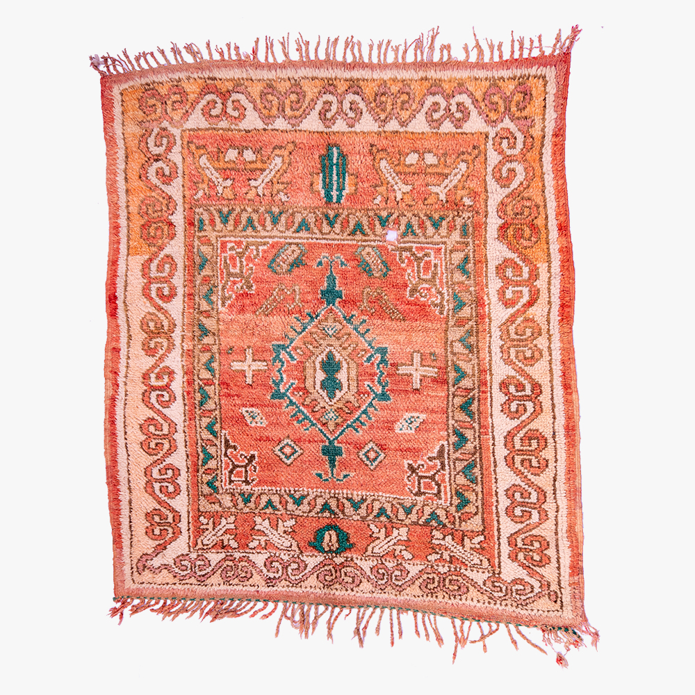 Dit authentieke berber tapijt, rijk aan kleur, patroon en cultuur, biedt een unieke mix van functionaliteit en kunstzinnigheid. Het is meer dan een tapijt; het is een gespreksstuk, een kunstwerk en een stukje geschiedenis geweven in een object dat de tand des tijds doorstaat.
